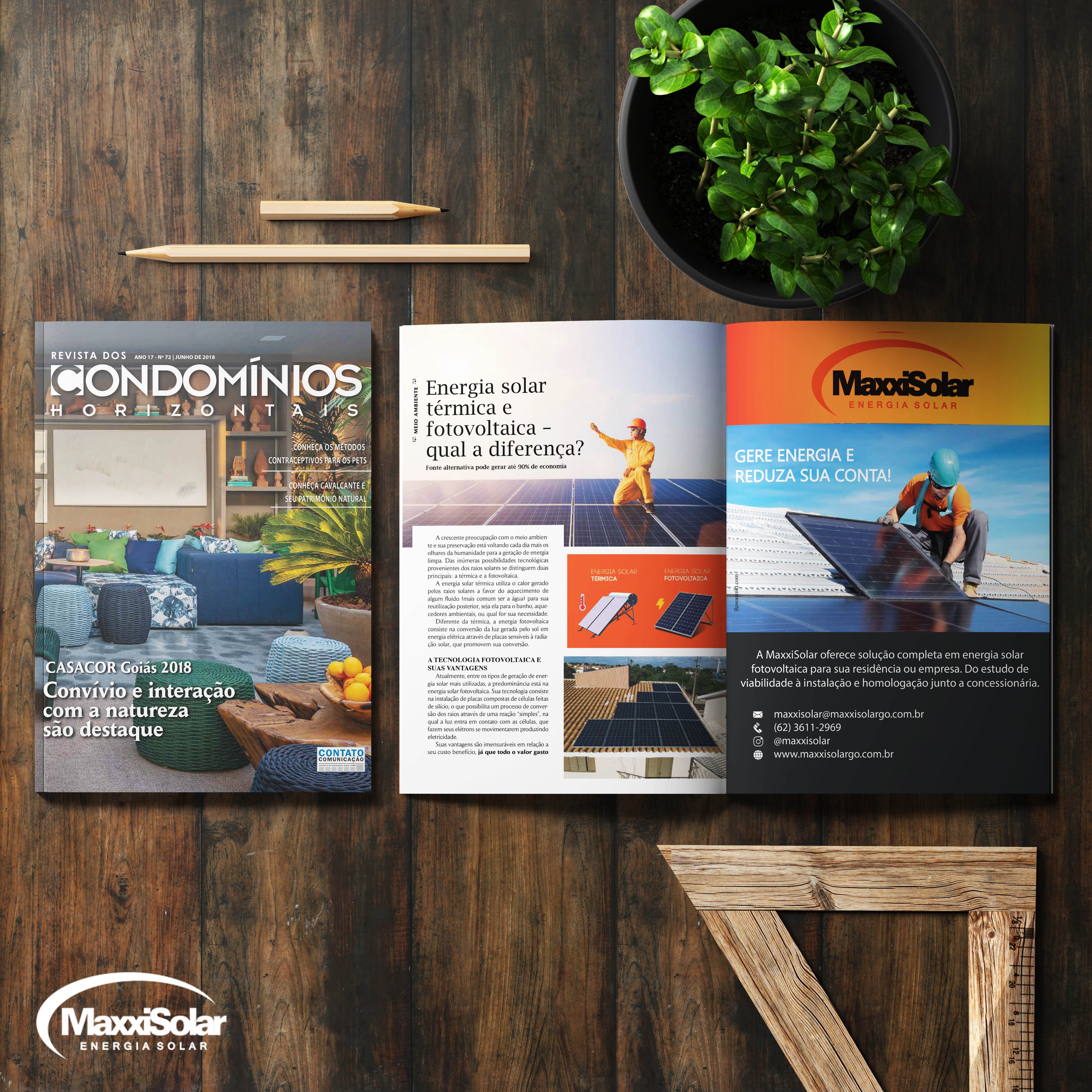 Em junho de 2018, em sua edição nº 72, a Revista dos Condomínios Horizontais realizou uma publicação de uma matéria que faz referência a importância da energia solar fotovoltaica, dando ênfase nas diferenças existentes entre ela e a térmica: “A energia solar térmica utiliza o calor gerado pelos raios solares a favor do aquecimento de algum fluido (mais comum ser a água) para sua reutilização posterior, seja ela para o banho, aquecedores ambientais, ou qual for sua necessidade.